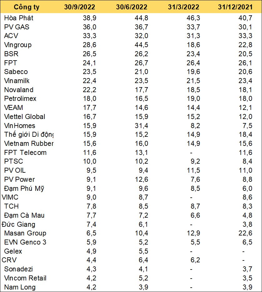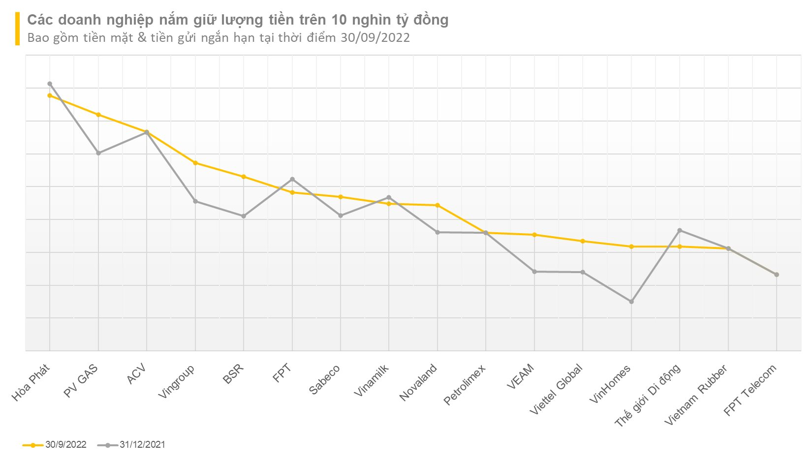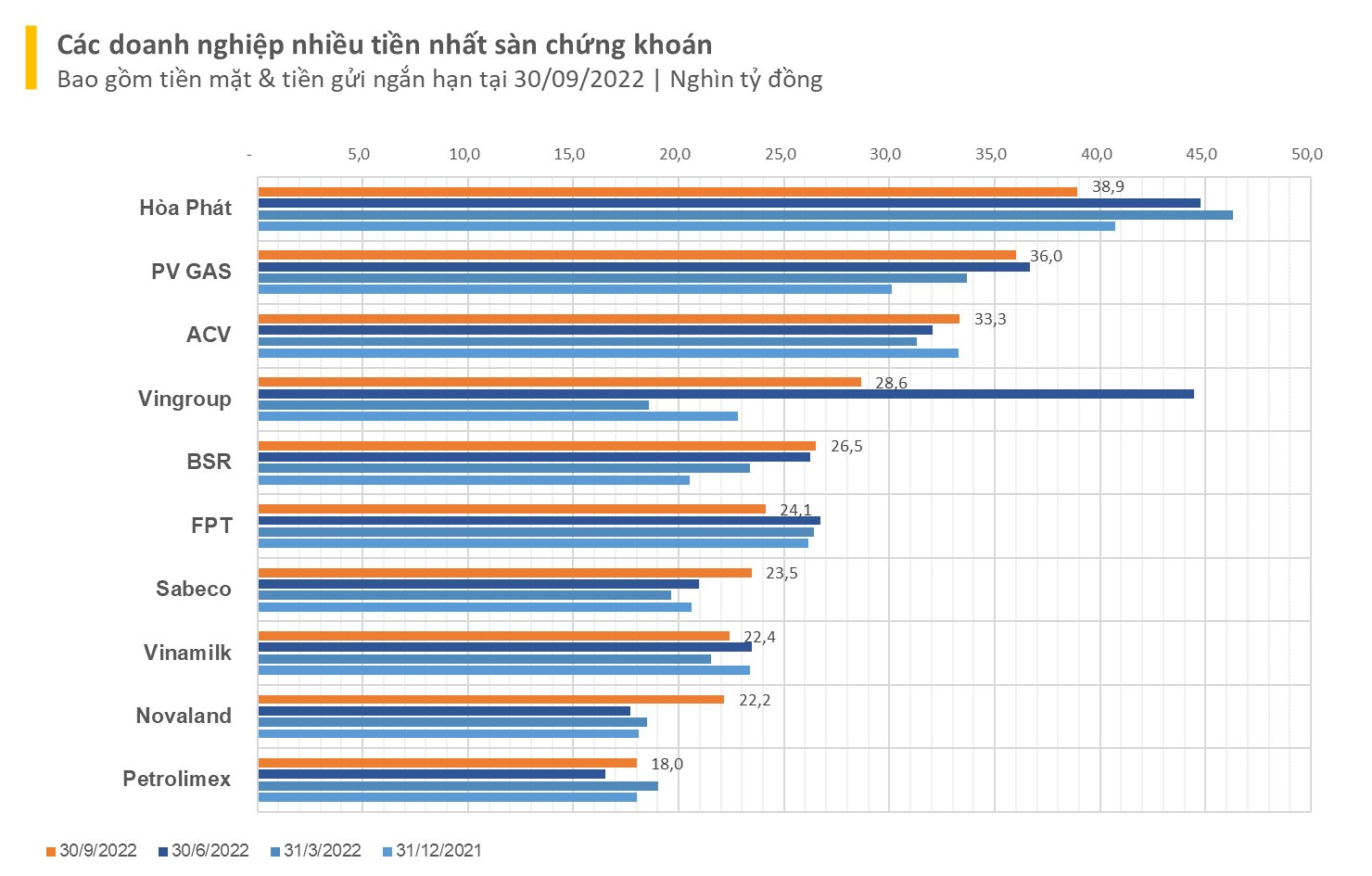 Top 3 gồm Hòa Phát, PV GAS và ACV đều có lượng tiền trên 30.000 tỷ, trong khi nhóm tiếp theo trong top 10 gồm Vingroup (VIC), Lọc hóa dầu Bình Sơn (BSR), FPT, Sabeco (SAB), Vinamilk (VNM) và Novaland (NVL) có lượng triền trên 20.000 tỷ. Petrolimex xếp cuối cùng với 18.000 tỷ đồng.